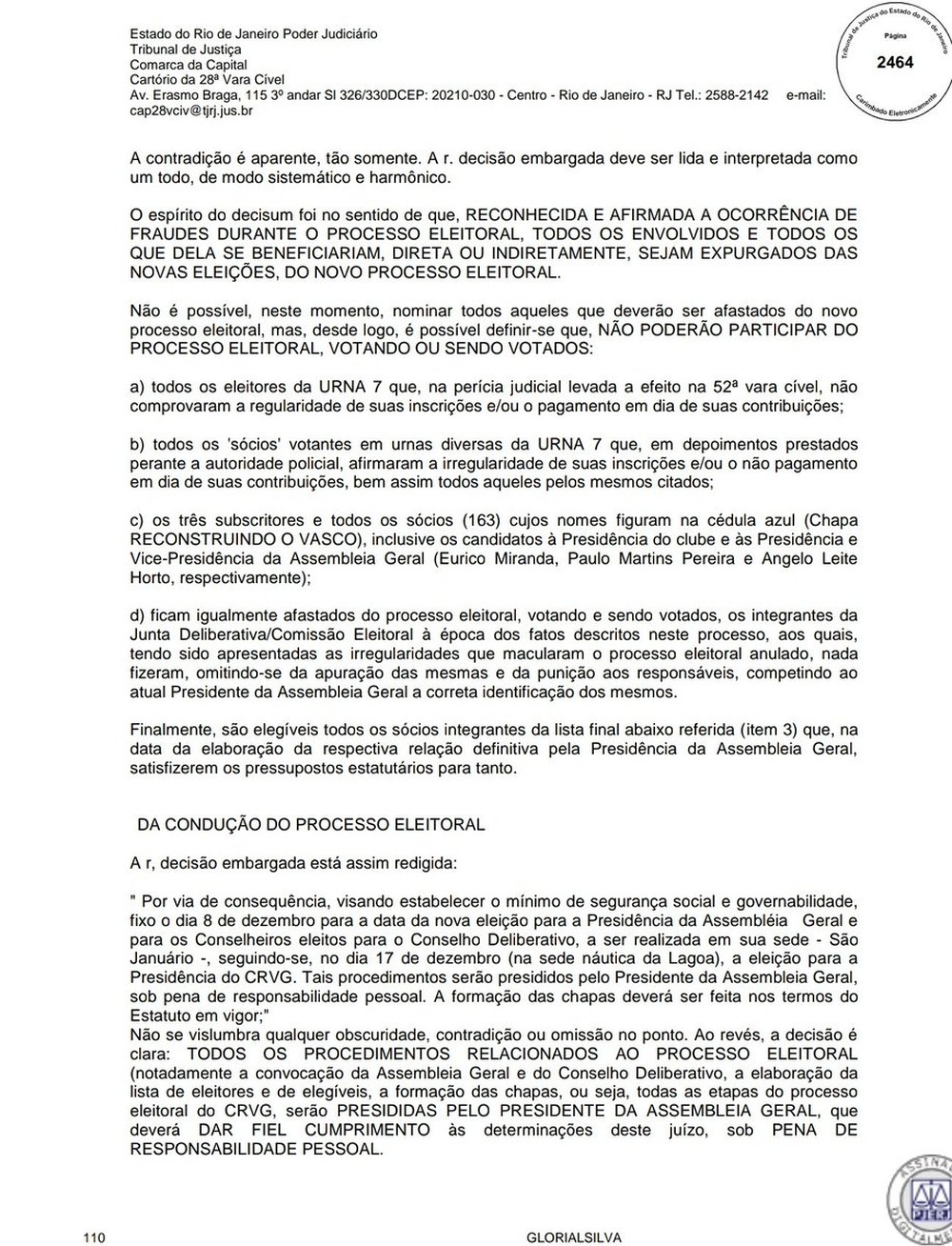Instantes antes de começar a coletiva com o pedido de união entre os vascaínos, a juíza Gloria Heloiza Lima da Silva esclareceu alguns pontos de sua decisão. O principal: estão inaptos a votar e ser votados todos os 163 membros da Chapa Azul, assim como Eurico Miranda (candidato da chapa) e membros da Junta Eleitoral.